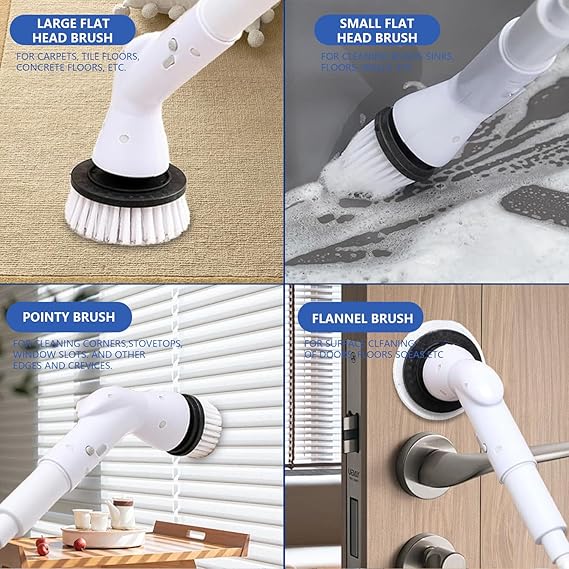 Comes with five brushes, two stiff flat brushes for large surfaces, an angle brush for curved areas, a flat brush for detail work, and a pointed brush for gaps. Each brush reaches deep into corners to effectively remove grout and stains. The handle extends to 38 inches for easy cleaning, so you don’t have to bend or kneel to scrub tubs and floors. All you have to do is hold it and it does all the work for you!